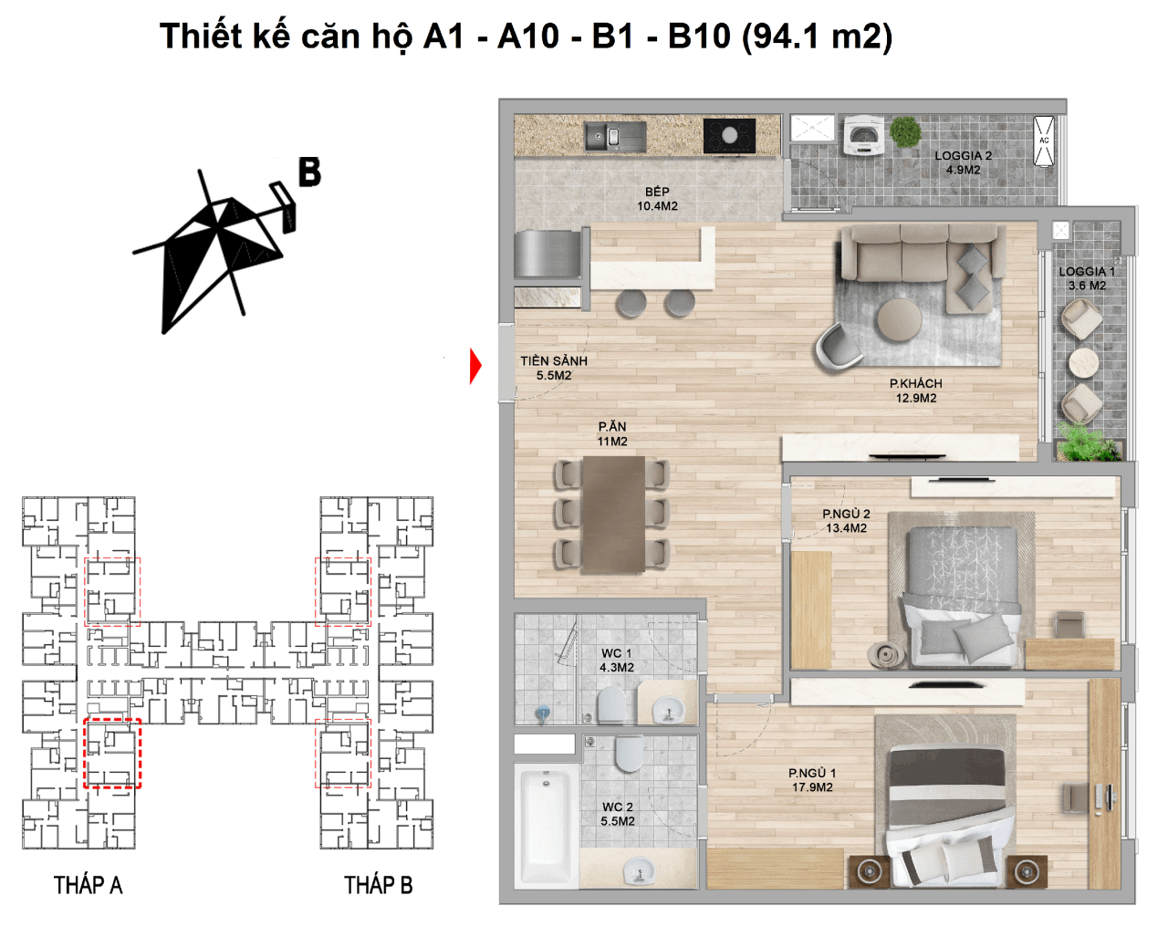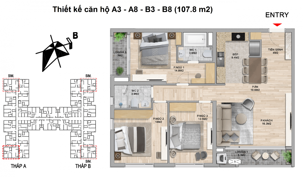 - Căn hộ 3 Phòng ngủ: 424 căn diện tích 104 m2 – 108 m2.